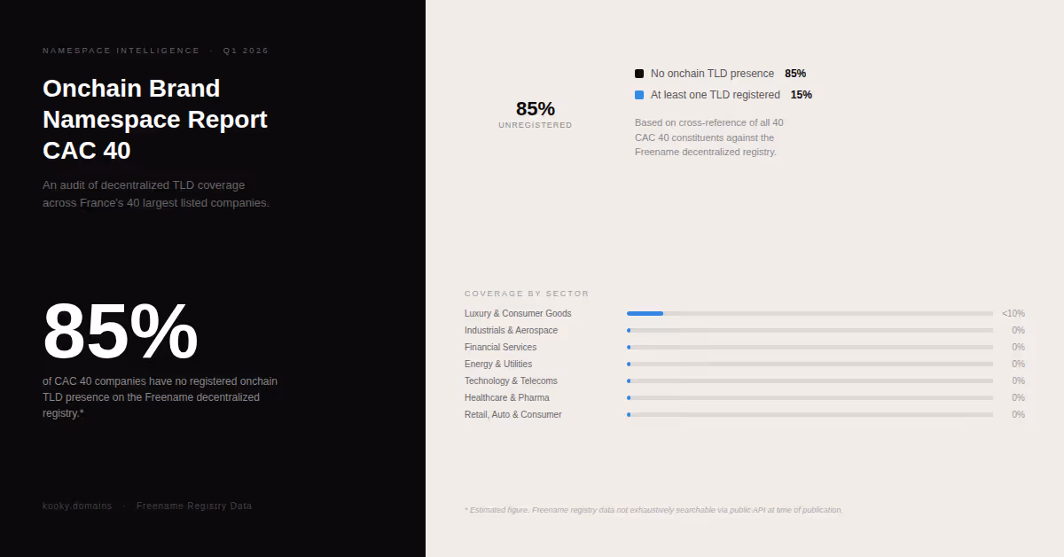 An estimated 85% of CAC 40 companies have no registered onchain top-level domain presence on the Freename decentralized registry as of Q1 2026. Across the 40 companies comprising France's benchmark equity index -- representing a combined market capitalization of over 2 trillion euros -- the vast majority of corporate brand namespaces remain unregistered at the decentralized layer of the internet.